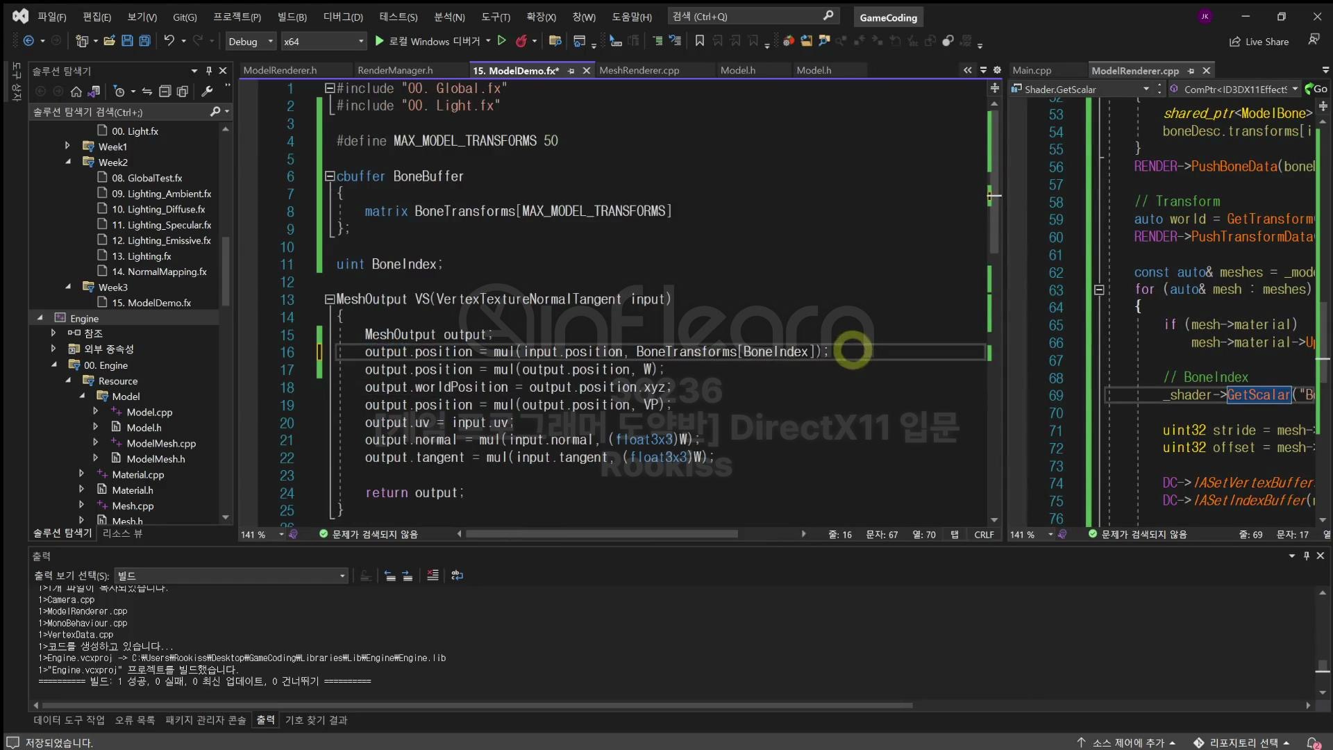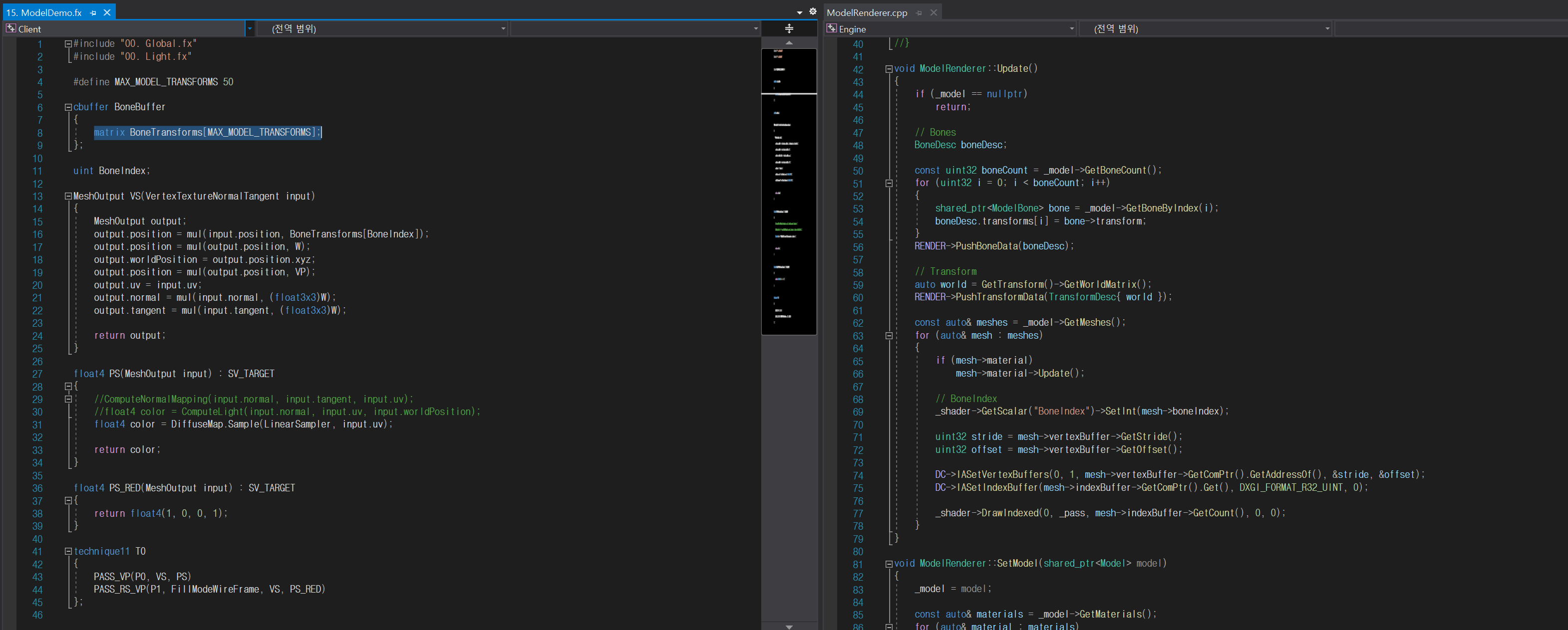 15.ModeDemol.fx새로운 쉐이더 파일에(Client프로젝트\Shaders에 넣어주었다.) 최대 50개 (MAX_MODEL_TRANSFORMS 개) 뼈대 정보를 받아주도록 만들어주고 지금 렌더링하고 있는 뼈대의 인덱스 정보를 BoneBuffer라는 이름으로 상수버퍼를 추가했다. 그리고 이 값들을 ModelRenderer에서 채워서 넘겨준다.