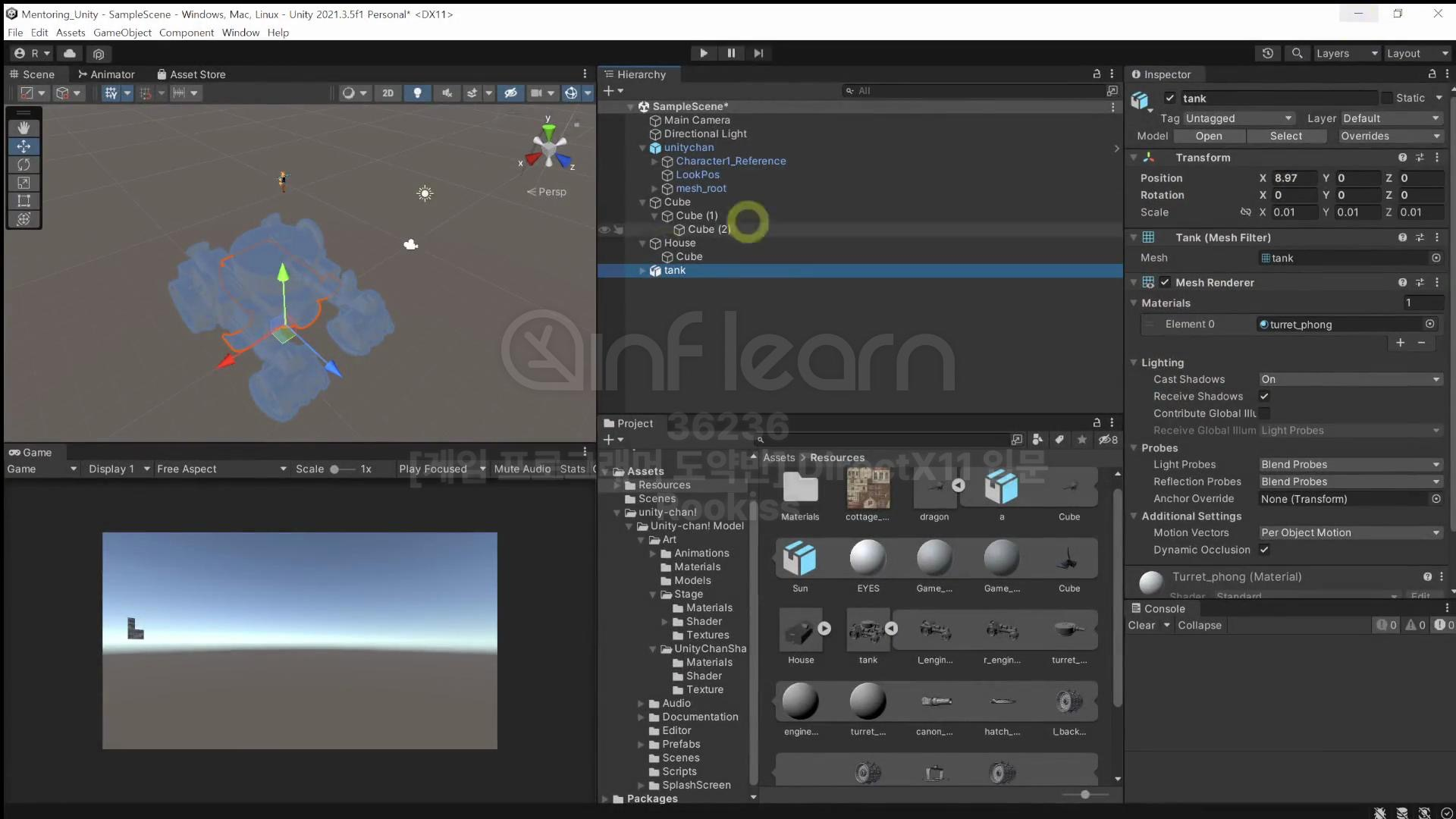 이렇게 IExecute를 상속받아서 Init, Update, Render를 만들고 연결할 쉐이더와 배치할 카메라, 그리고 게임오브젝트는 다를 샘플데모와 똑같다. 다만 CreateTower, CreateTank를 연결하고싶은 게임오브젝트에 따라 Init에서 호출하게 했다.