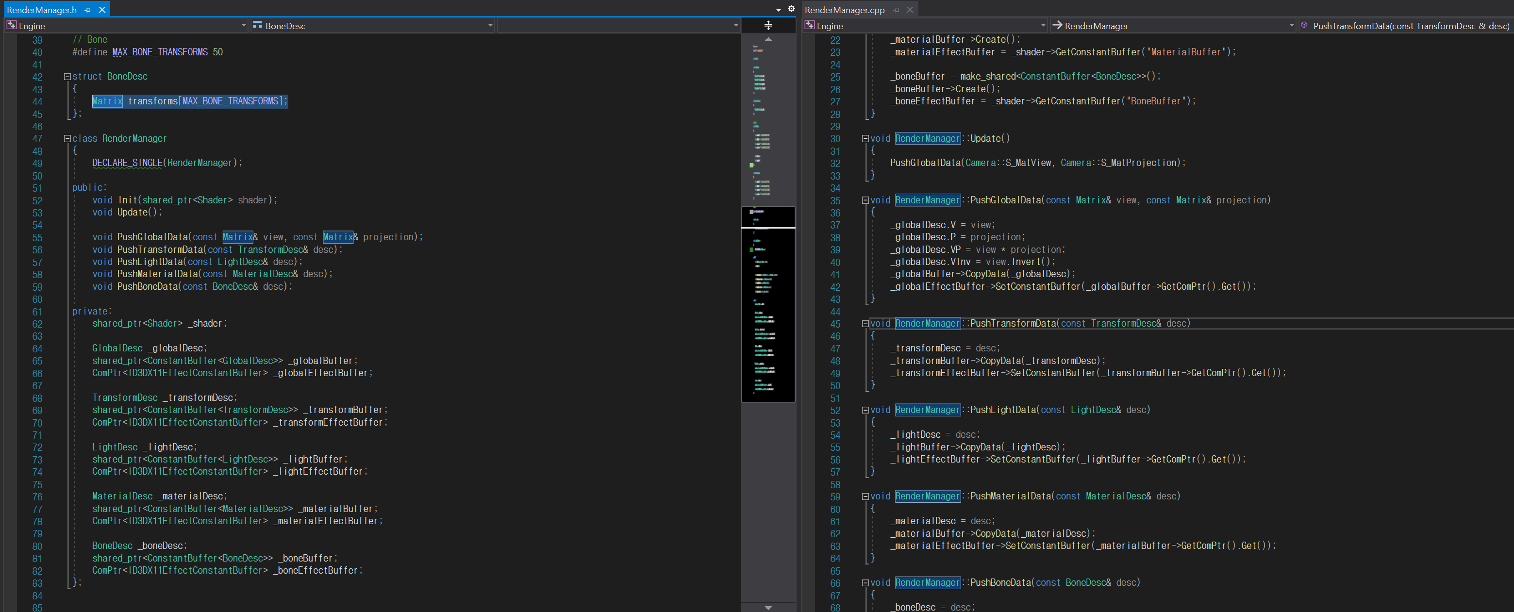 RenderManager에도 같은 정보를 추가한다. ModelRenderer에서 호출할 PushBoneData도 만들어줬다. 상수버퍼 BoneBuffer를 채워준다.