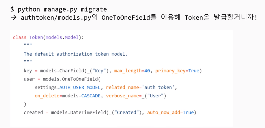 이 authtoken의 onetoone의 모델필드를 바탕으로 토큰을 발급할것이므로