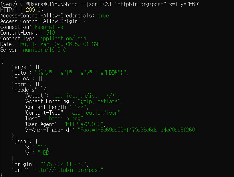 http --json POST 대상주소 GET인자==값 POST인자=값