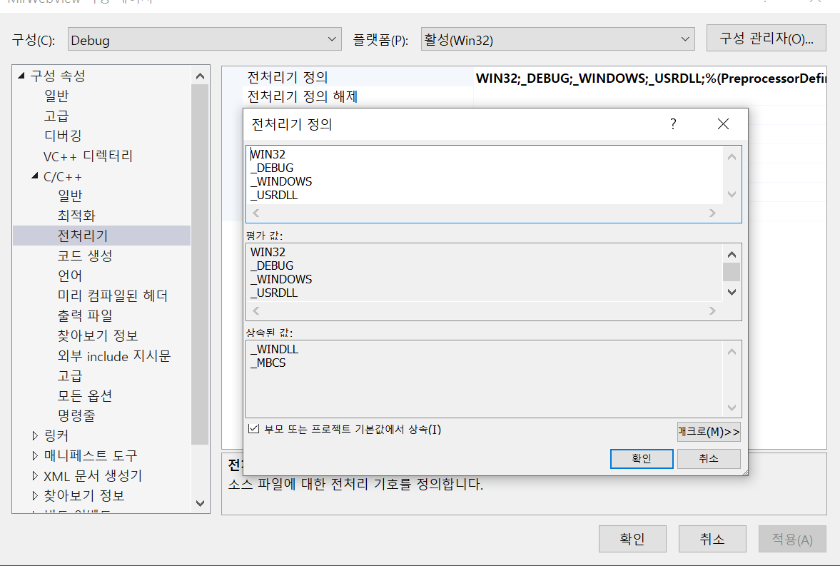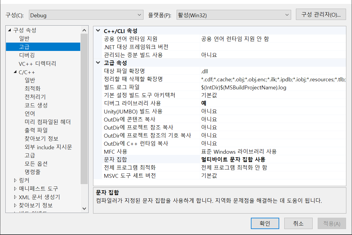 이렇게 전처러기를 멀티바이트(_MBCS)로 설정한다. 유니코드시 상속된값에 _UNICODE, UNICDE가 둘 다 설정된다.