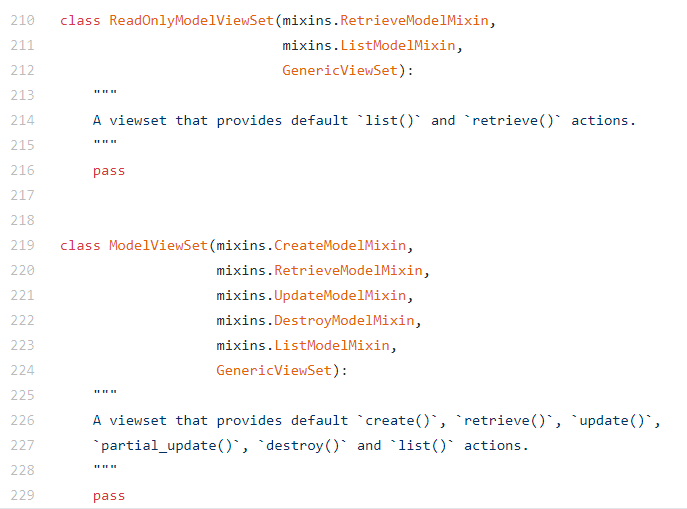 다른 클래스들도 있지만 ReadOnlyModelViewSet과 ModelViewSet를 가장 많이 쓰기에 둘 만 가져왔다. 둘의 내용은 정말 없다. 상속해서 하나로 묶어주는게 다 이다.